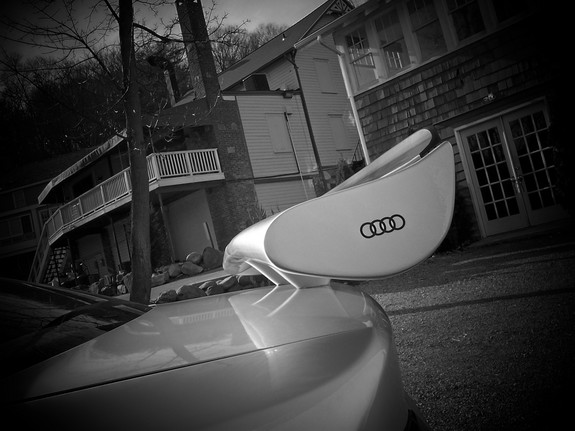 This replica of the Audi Factory Touring Car Racing Wing (named LLTEK's TC-Wing), is now available through efforts of the German styling team UBERHÄUS. Identical, save color, both wings were here just long enough to get the camera and capture these snaps - remember, you saw it here first. Slightly modified for everyday "street" use - this aero modification is nonetheless faithful to the original Touring Car design concept. For example: the original wing is wider on the side, by 4 inches - while the LLTEK TC version does not have this large overhang and is considered "pedestrian friendly". In addition, another small difference is the size of pedestals used on the LLTEK TC version. The footprint on the LLTEK TC version is larger - so that two screws can be accommodated in each foot drilled through to (not shown, but located up against the interior of the trunk deck and hidden under the carpet lining). The race version needs to stand up to higher speeds, but the street version will take speed plus the pushing, prodding or pulling by the aforementioned pedestrians. Call today and place a reserve order on our upcoming consignment from Europe. The kit is available at a price of $333 (U.S.) plus shipping. All mounting hardware included