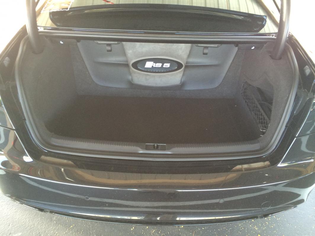 • The trunk light connects to the custom built wall with “RS5” logo and has clear LEDs on the in the logo as well as red back-splash color. The RS5 logo was done at a local glass shop where they etched the symbol so if you plan to put this in an A5/S5 you can easily get that piece replaced.
