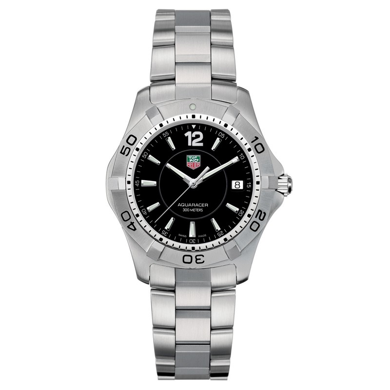 Sporty dial, luminescent hour markers. Date at 3 o'clock. Coloured TAG Heuer logo. Marking - AQUARACER 300 meters.