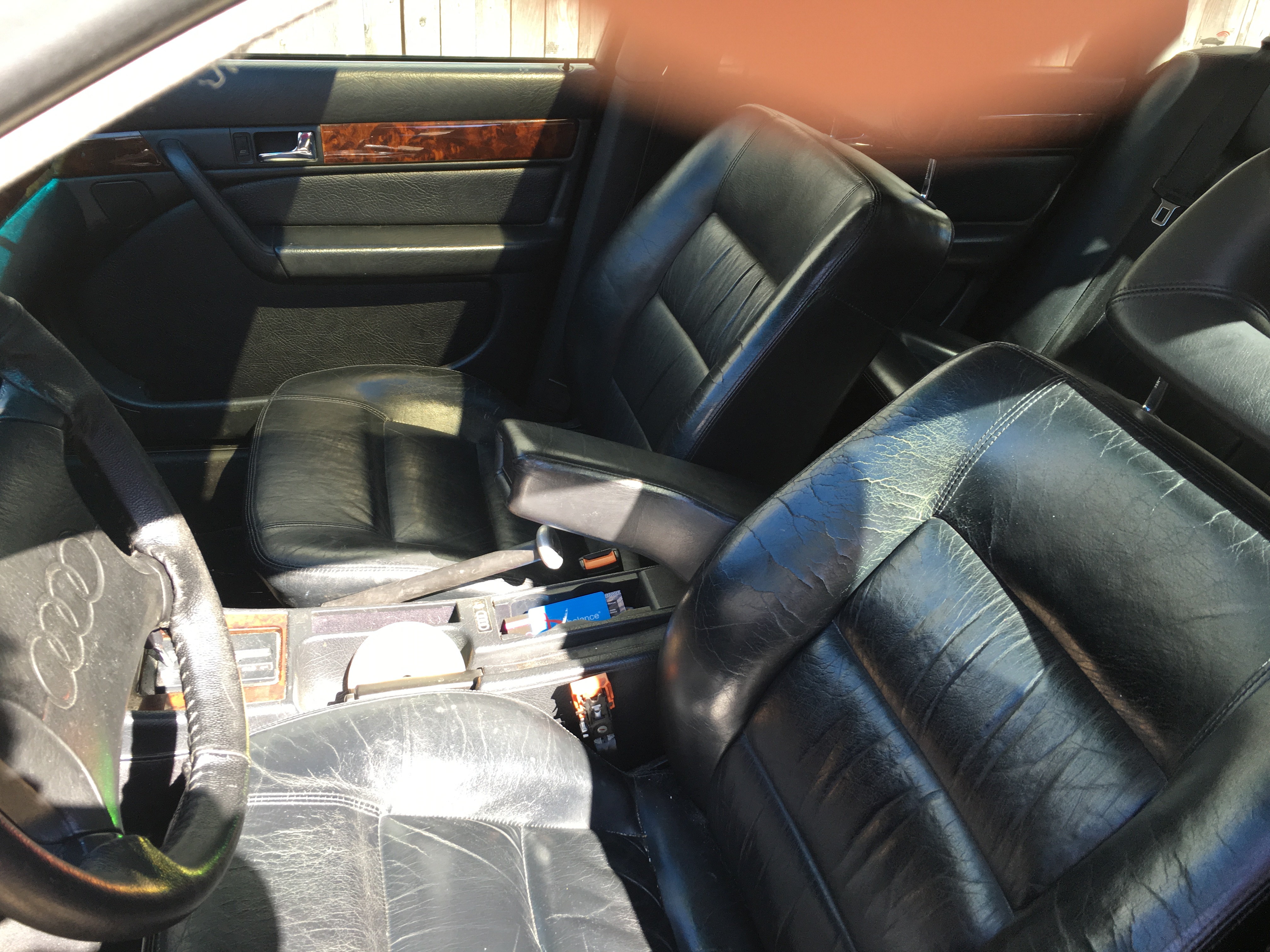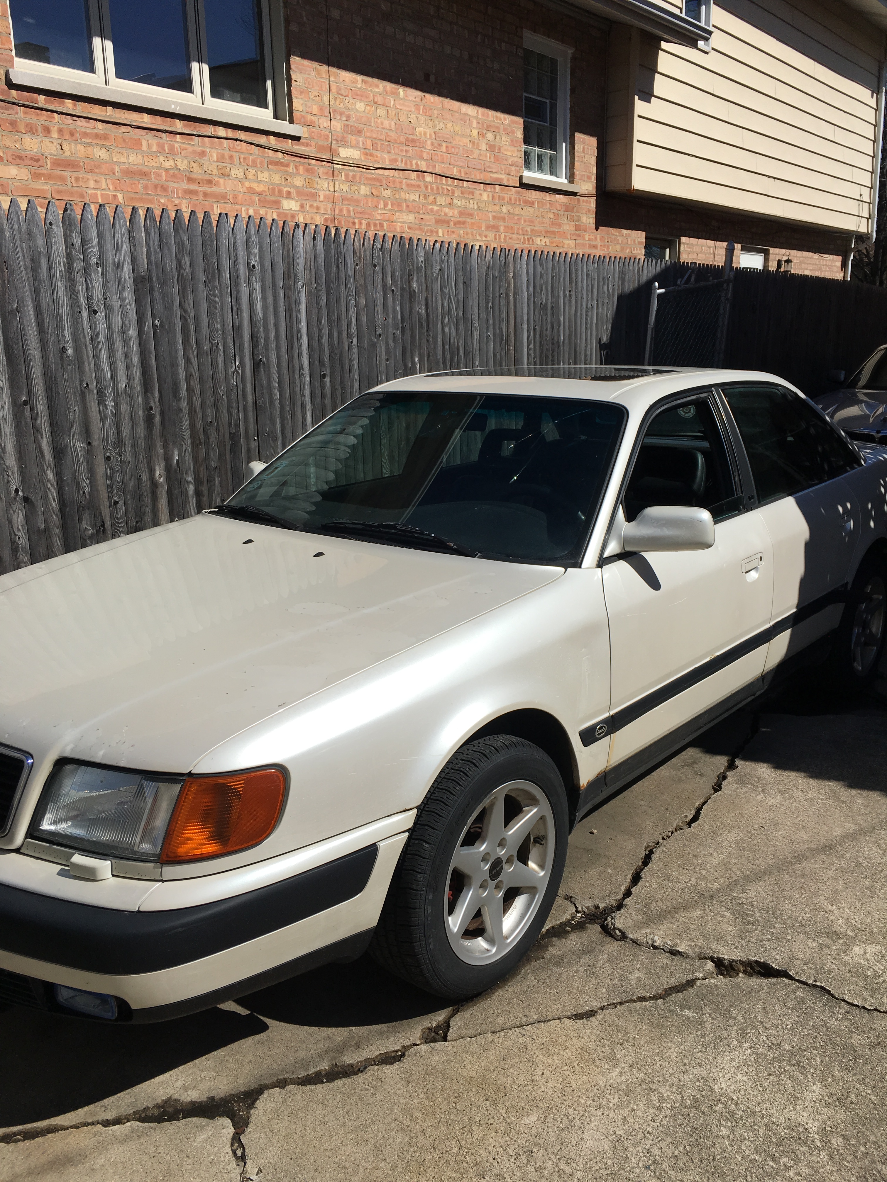 You know how those father son things always look so great in the commercials?? Well, this one went OK but then: because Audi. New radiator and oil cooler $800, new heater core $800, multi function switch (trans shifter switch)$500... (I could have done them myself, but not in sub zero winter) Sunroof works, black leather interior is great, driver's seat pretty good. It's the galvanized body, so it's almost rust free pearlescent white. Bad part is that it has that old R12 so no go on the A/C. Windshield has a small star and l-f fender is dented: thanks a-holes. Runs and drives great though an exhaust manifold gasket is a little noisy on one side. Good to restore or swap the engine and trans into a convertible. Easy strut cartridge replacement from above. Let's see if the pictures upload (I've done this five times already lol) First $1,000 takes. Edit: PS looks much better in pictures, but still not some hulk.