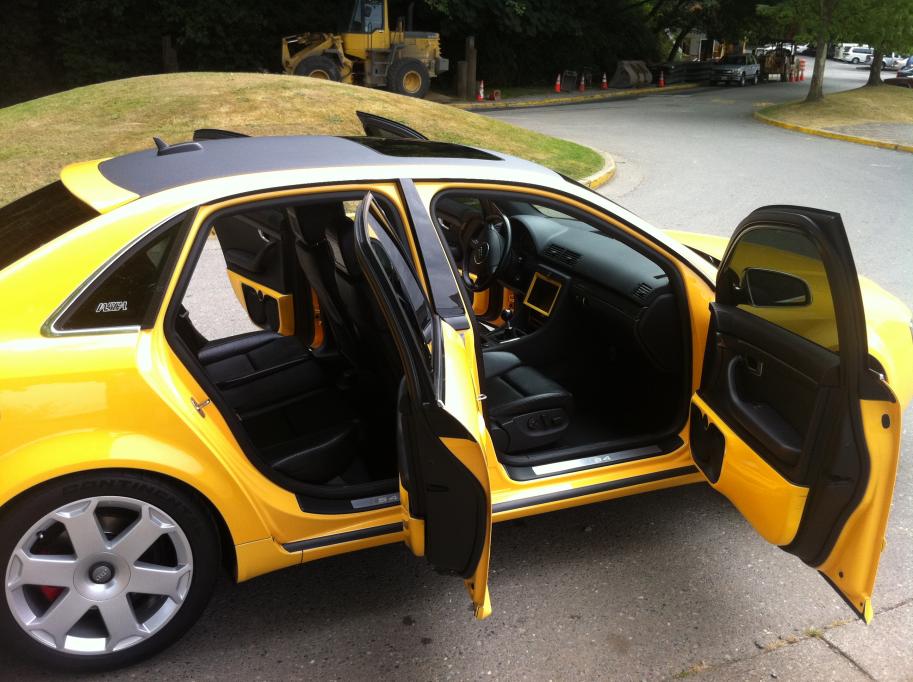 I have a very nice 2005 Audi S4 Sport Quattro Sedan. I am the original owner with 38,673 miles! Yellow with Black Leather Recaros, factory powered by a 4.2L DOHC V8 rated at 340 HP @ 7,000RPM and 302 FTLBS @ 3,500 RPM! 6 speed manual transmission with AWD center limited slip differential, explore all kinds of speeds this car can handle. Getting 15 MPG City and 23 MPG Highway this is something that will make you want to wake up to make that drive to work. These S4’s will go 0-60 in 5.5 seconds, 0-100 in 13 seconds and has top speed of 155 mph which is where the governess at. You will notice this car driving down the road with its exotic look, like side skirts, dual chrome exhaust, bold front look with the original radiator grill and grad patterns inserts. To top it off the 18 inch Audi Avus design wheels give it a luxury/sport look. The interior is no let down as well with sport 4 spoke leather steering wheel, sunroof, fiber carbon inserts, Automatic dual zone climate control. Some of custom work includes; custom dash, consol, Door component speakers on custom enclosures, fiber glass sub boxes both sides in trunk, rear speakers pods and video screens and after market radio head unit. I am the original owner of course I have originals sets of keys, MSRP was $ 50,000!!! Plus custom work over $15,000