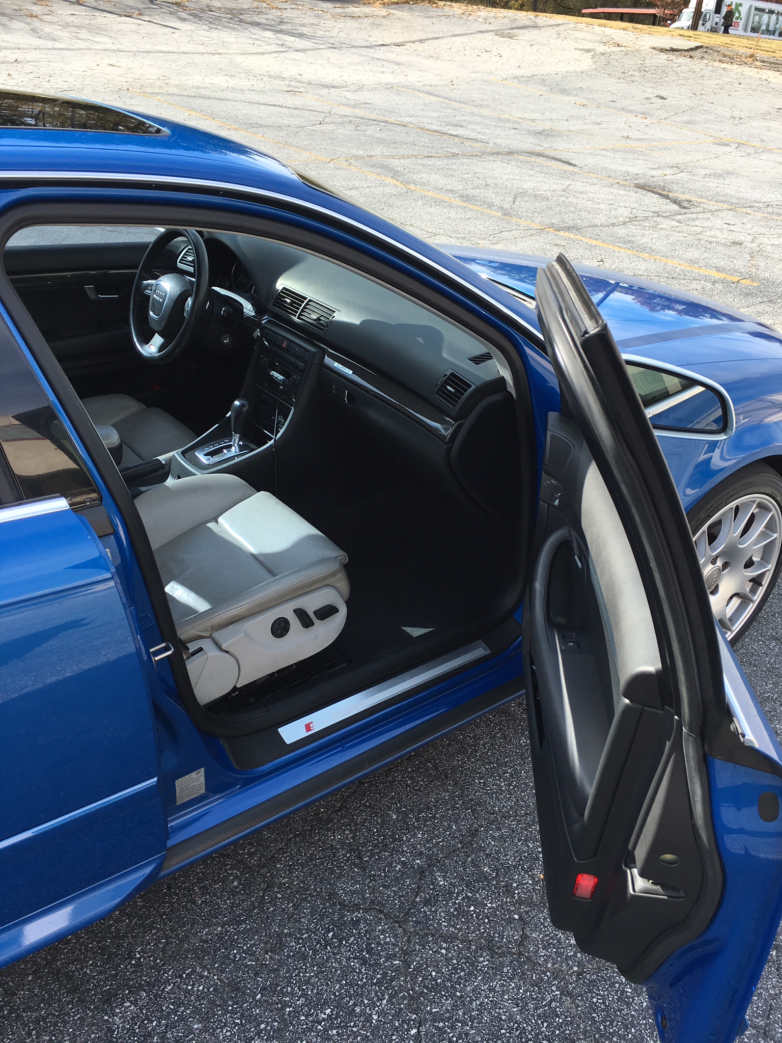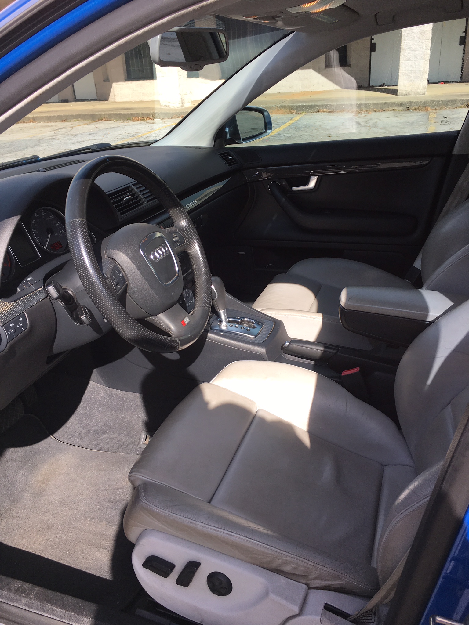 It is in the signature Audi sprint blue pearl effect paint over gorgeous silk gray interior. It also comes with the almost $3000 premium package with glass sunroof, homelink, heated front seats, etc. Also comes with $1000 Bose audio package. The interior has the carbon fiber trim and the carbon rear spoiler. The desirable 18'' double fork style wheels are in fantastic condition. The side windows have a light tint.