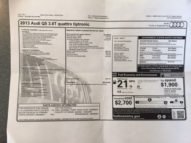 3.0T Quattro, Moonlight blue metallic, w/pistachio beige interior, only 22,300 miles. Like new condition. Bought this in fall of 2016 as an Audi Certified Vehicle, 6yr 100,000 mile warranty transfers with vehicle. Only selling to buy a Touareg. Options include: Audi MMI, Nav, B&O stereo, trailer hitch, fine grain ash natural inlays, 19" wheels. More pics available. Asking $34,000