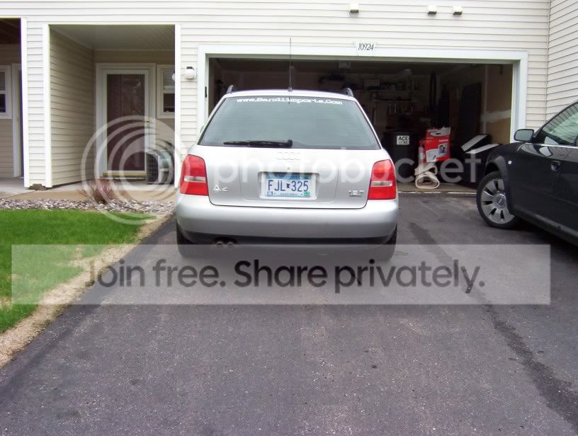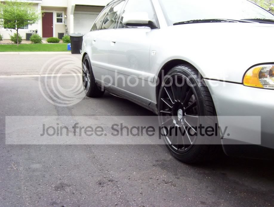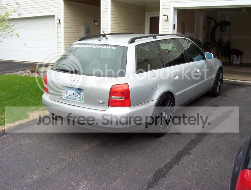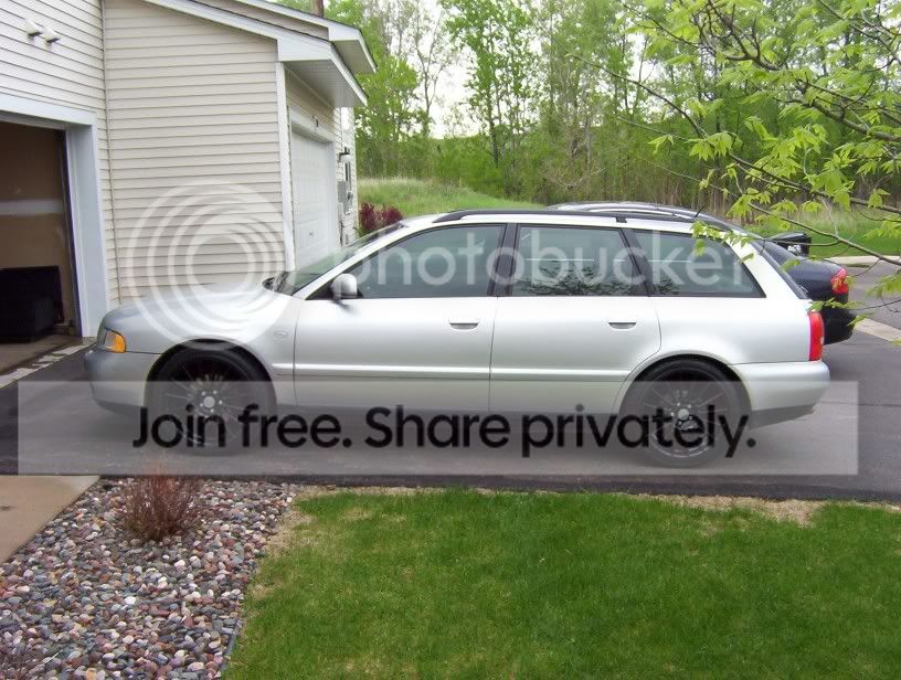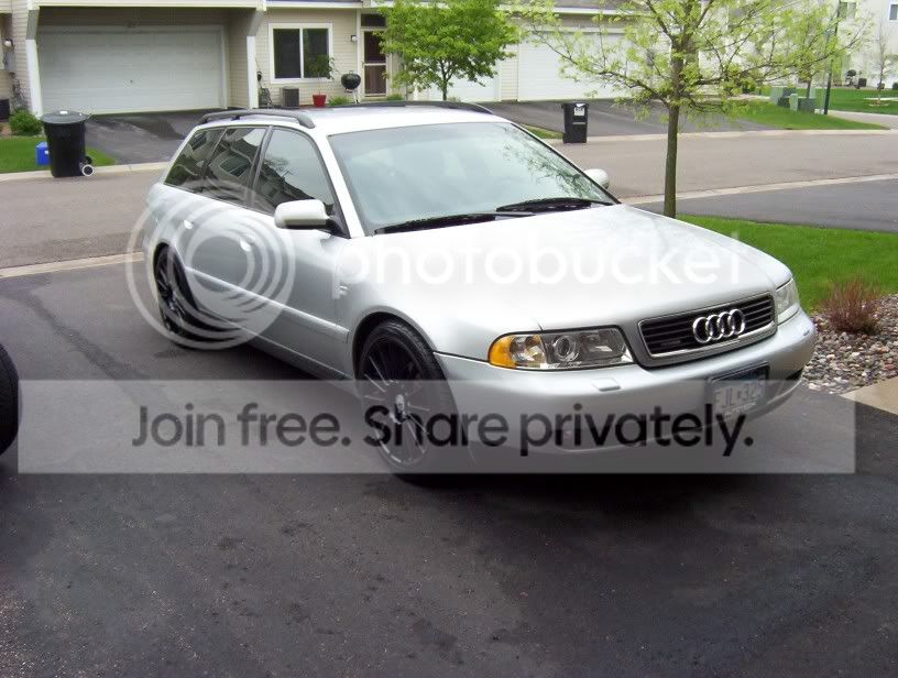 '00 A4 Avant 1.8t quattro 5spd, silver w/ blk leatherette, 50,600 miles, blk roof rails, cold pkg only, cleared corners, rear emblems removed, NO sunroof(lots of headroom)! 5k miles on Eibach Pro-Kit suspension, blk powdercoated 18" Allutec Zero 16 spoke wheels w/ Toyo Proxes 4. 50% tint. Still have stock suspension and 15" alloys with new alll season Bridgestones. New Thule rail mounts included. NO ENGINE MODS!!!!!!!!!