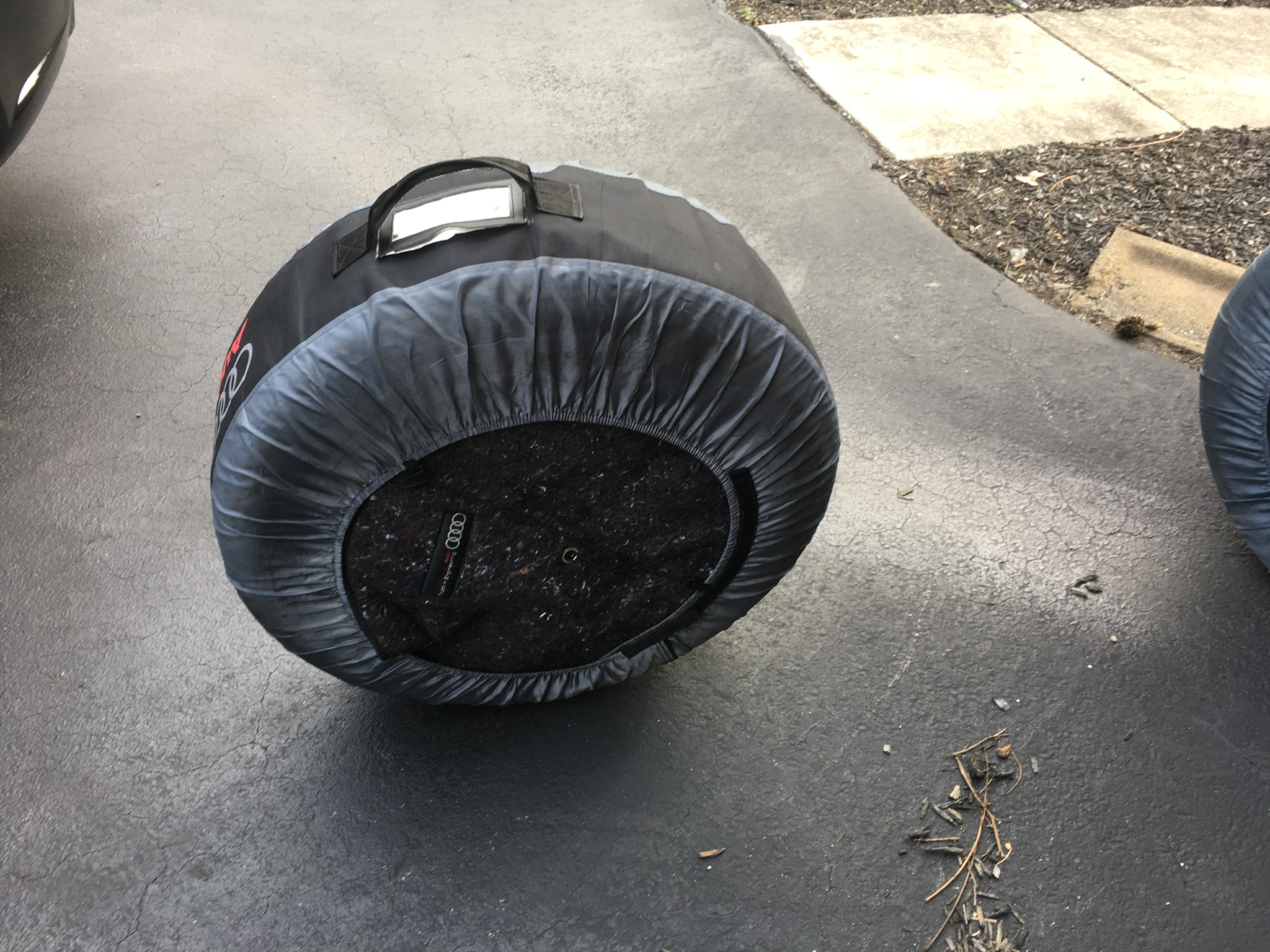These are being sold now as I am selling my Audi for a new car. The rims have no damage to them at all, and the tires are in great shape. Wheels were just balanced 1 month ago by Audi Devon in PA. Selling at a deep discount from my original purchase price of over $3300. Includes the 4 wheels/tires as well as the tire carrying totes and felt protection pads.