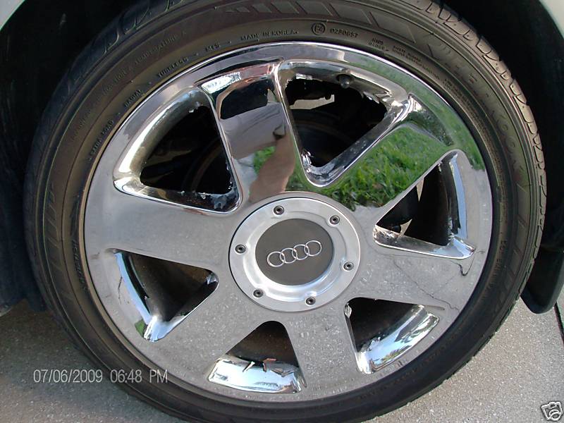 The wheels are in great physical shape, but the chrome is peeling badly on all of them. Would anyone on the forum like the wheels unfinished for $100 each plus shipping? They don't have any dings or road damage, just the chrome peeling. They are 17x7.5 5-100 wheels. I'll also sell them for $225 a wheel powder coated and clear coated in any color. I'll have the center caps coated the same color too.