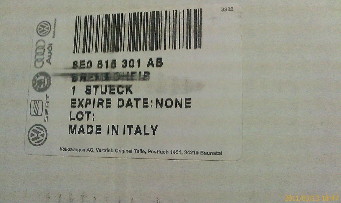 A pair of new OEM front brake rotors for B7 chassis RS4. Fits 2006-2008. Two piece, cross-drilled, original equipment part# 8E0 698 301 AB. $600 plus shipping. Will ship to U.S. only. Part number is for the pair. Individual rotor part number is 8E0615301AB.