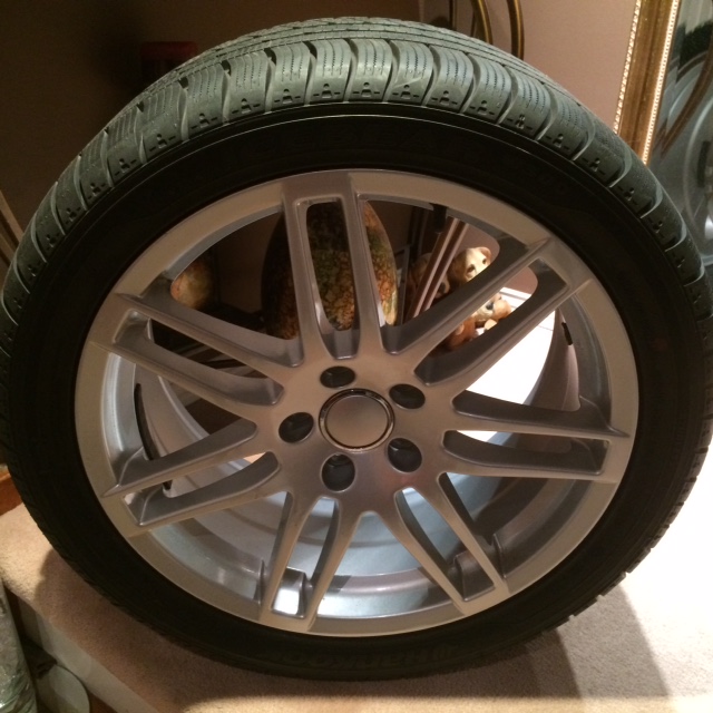 Beautiful powder grey rims with Hankook Icebear winter tires. These were run on a 2010 S4. They were used for 1 season (3 months), and are in excellent condition. Wheels have no dings, dents, or curb rash. This stylish wheel design is very easy to keep clean.