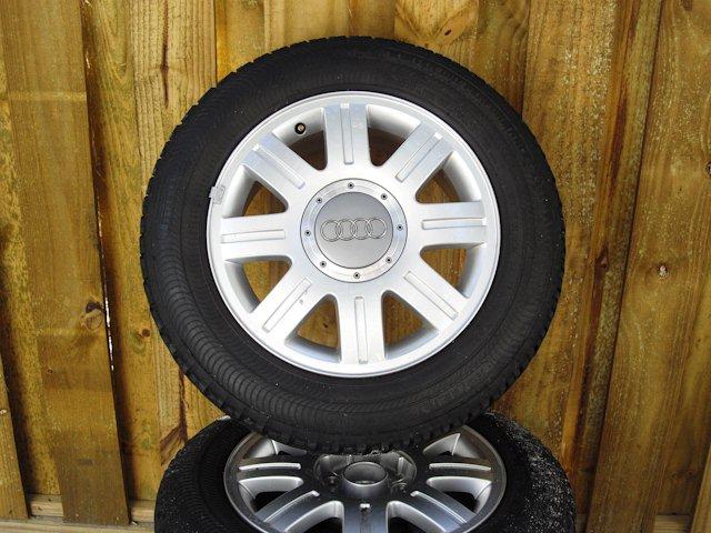 Set of 4 15" wheels w/ tires from my 99 A4. Purchased for winter use up north. Only used for 3 winters. The wheels are straight and true and run smoothly. They have a few minor scratches from normal wear. The wheel pictured has the most obvious of the scratches with 2 small dings caused by being dropped on something at the shop. The tires are a matching set of Dunlop Winter 190 Performance 195/60R15 91 T. There is tread remaining and they in good working order and have no signs of damage. Local pickup preferred. Asking $150.00.
