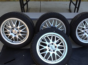 The tires are Dunlop sp wintersort 3D 245/45/17. The tires have 90% of tread left not many miles on them. The rims are in very good shape. A few of the center caps have a small amount of corrosion on them other than that no problems. There is also a set of lug nuts that go with them. The floor mats say A4 on them no tears or holes