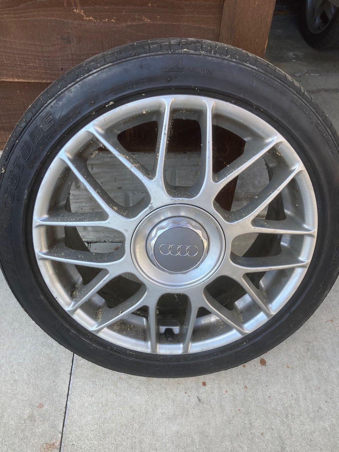I have a set of five BBS 17x7.5 16-spoke factory wheels with screw on Audi center caps from a 2002 Allroad - if anyone is interested I am open to your best offer before I put them on Ebay. Four have good BFG GForce tires and the spare is Bridgestone RE040. 235/45-17. The wheels are not in perfect condition, they have been used since 2002, but still look good. I'm not sure what they are worth to anyone, so I am taking offers. I can get more pics for anyone that is interested.