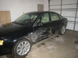A week ago I was T-boned on my drivers side door, and its now official that shes totaled. I was sitting at a stop sign when bam some cute girl wanted to meet me. I should explain to her that a simple hi would suffice next time. As far as damage goes replacement is as follows drivers side: front fender, front door inside and out, outside of rear door, center pillar, and all trim along the bottom along with some flooring on the inside.