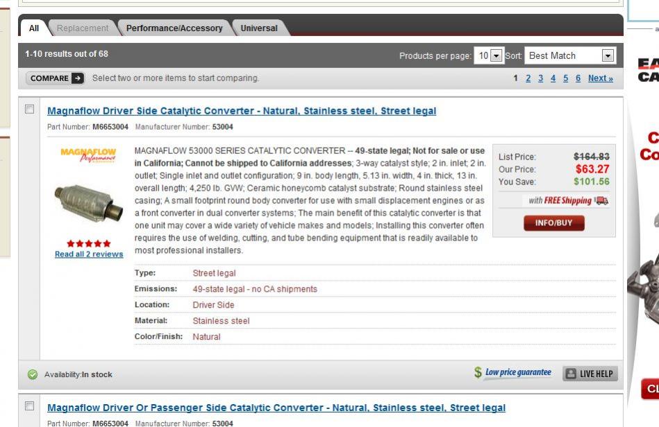 If you are in California, most shops will not install 49 state converters. Unfortunately OEM is the only available/approved converters for our cars in CA that I know of. If someone has any info on inexpensive 50 state legal converters, please chime in.