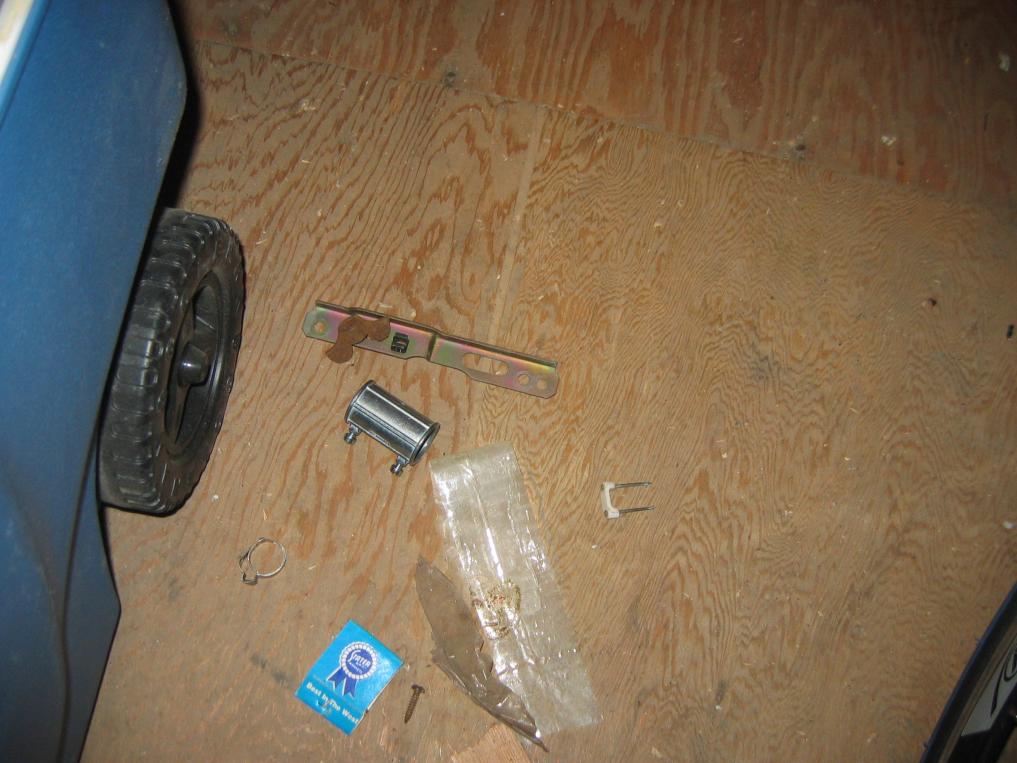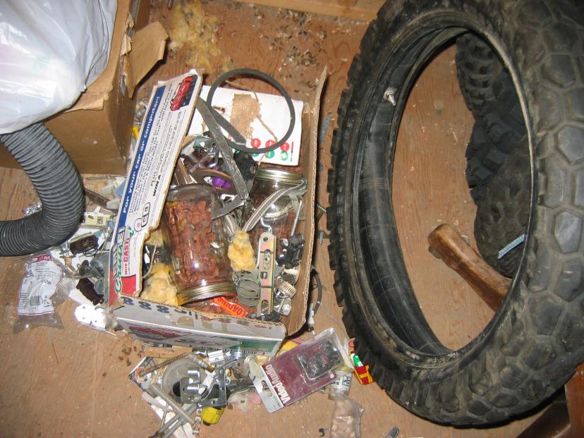 Living at 8,000' and therefore surrounded by nature and. . .animals, I awoke at 0400 hours this morning (Yikes! ) with an inspiration/idea about those blasted missing Engine Top Cover:Fuel Rail Mounting Brackets. I dont know about the rest of you out there, but my own cognitive dissonance kept me reviewing in my mind a possible solution and was increasingly convinced that they were around here somewhere. Well, you've all heard of the "Rat Pack," that band of Las Vegas Entertainers (Sammy Davis, Frank Sinatra, Dean Martin, etc.) right? Well that name is derived from Pack Rat!!!! We got 'em up here and, to be more precise, we've got one in our garage attic residing for the winter. They're amazing little fellas, collect just all kinds of stuff from one's house for their nests, are a bit sloppy in their home building and tend to leave a trail of debris all pointing to their home/nest. Discovered one up there about 1 month ago and decided to leave it alone until the spring when I'll trap him and relocate him elsewhere. They're pretty harmless other than making a mess of things as they rummage through my junk for his junk!!!! So, I awake at this very, very early hour with the idea that maybe, just maybe, I'll find those two brackets in his collection and . . .sure enough, there they are! Take a look at the two pics of the Crime Scene!!!!! He's not gonna be happy with my retaking of those brackets, but I'm sure we'll negotiate some kind of settlement. Amazing animals. . .I had those brackets on my makeshift workbench, the hood and trunk of our '74 BMW 2002tii. They were with ALL the other parts and pieces for the job including scores of screws, nuts and bolts and he never touched anything else except those TWO brackets, nabbed them and took them one by one up the stairs and into the attic!!!! Glad it's ended this way and just had to share this hillarious end to the missing brackets.