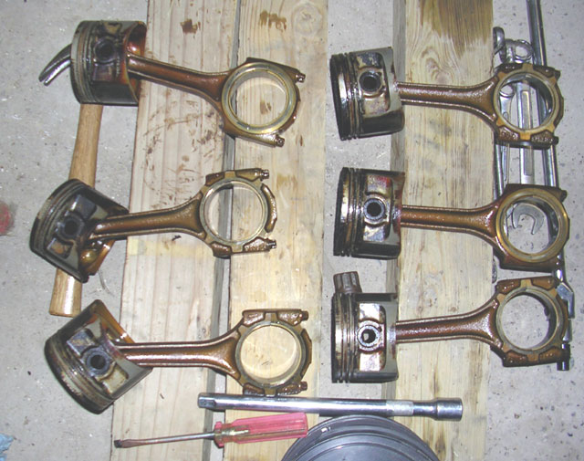 This evening I also took the pistons and the crank out. The engine block will follow suit on the cleaning trail tomorrow. I hope the guy can finish everything by next week, although he's pretty busy with the farming season that just started (or starts...). It is the only machining shop in town. I'll keep my fingers crossed.