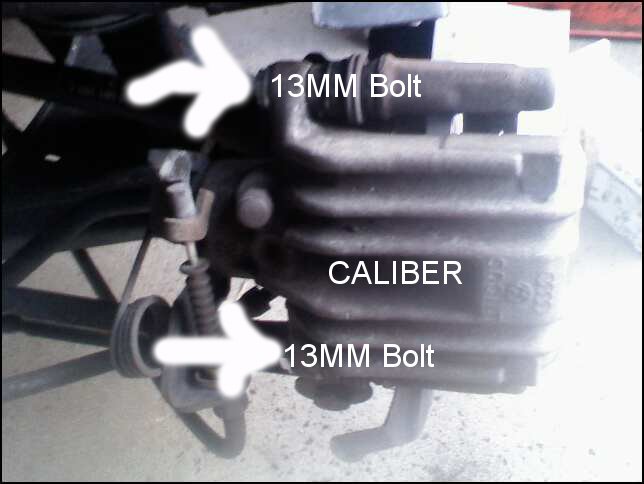 Start by removing the wheel using your impact gun so you can gain access to the caliper, old pads, and rotor. The first thing you need to do is remove two 13mm bolts holding your caliper onto the rotor. (Pic #3) There is one on top and one on the bottom towards the ground. For this, I found I had to use a wrench (not the 8mm Allen) to hold the inside bolt of the caliper still, while I loosened the 13mm bolt.