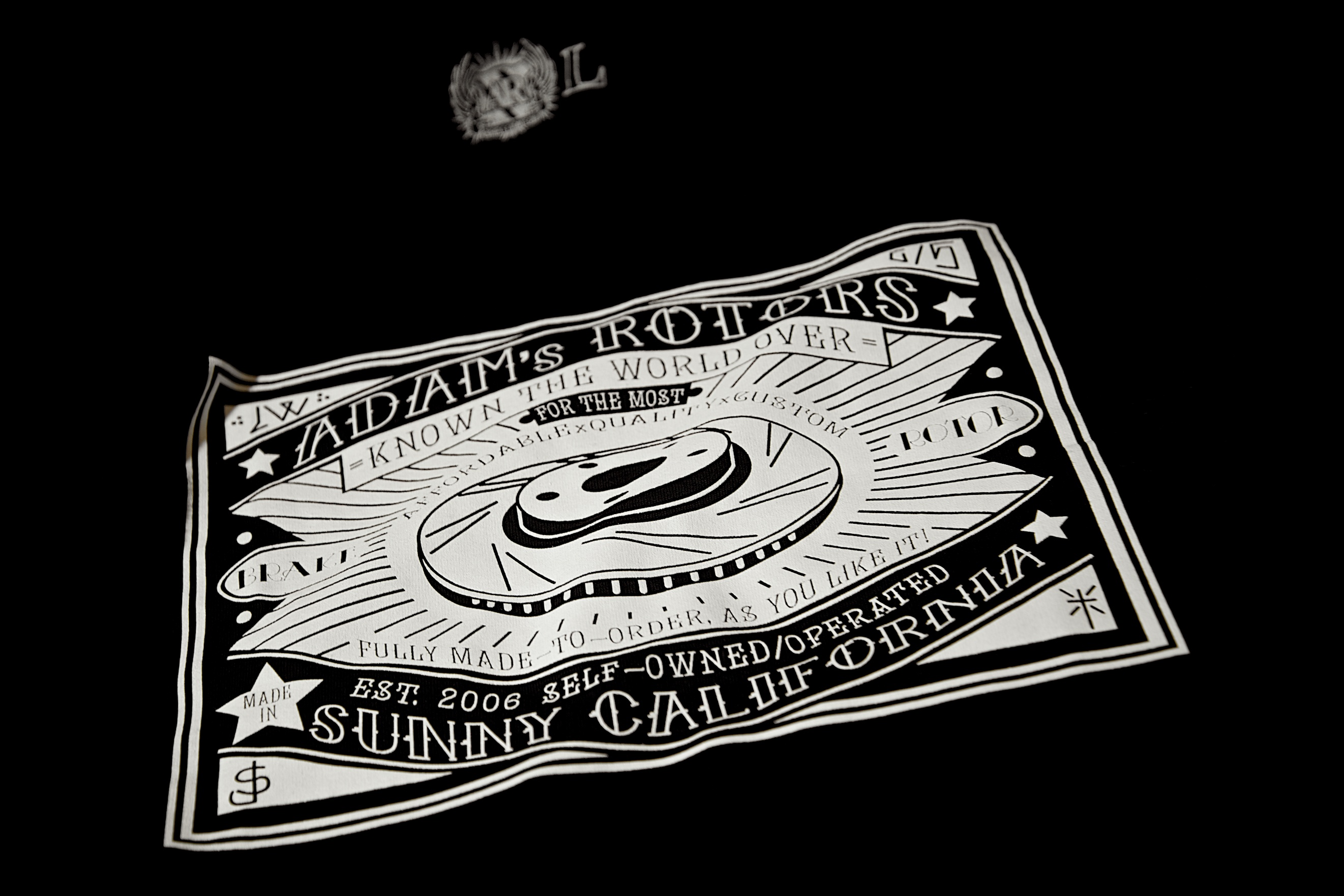 the design is entirely his concept, put into reality by an old-timey hand crafted plate maker, Fortress LP, using the original techniques of letterpress printing from the early 1900's. the end result is very much Adam's personal style and was a huge hit once completed... after years of people asking and a design worth using, we've finally decided to press out some AR shirts. we'll be using a top quality, standard fit, heavy cotton black T-shirt with white screening on the chest, big front & center. it will be tagless, including a custom AR logo & size image on the inside neck as well. these are pressed out of a high quality studio in Southern California who does many of the surf & skate brands up and down the state. here's a sample of the image itself... Attachment 24400 once the shirts are finished and delivered to the shop, we will shoot them on a model and get them added to the store. we are taking pre-orders now if you want to snag one as a part of the first run...it's a small starter batch for family, friends, and loyal customers; so act now to lock one down. we will be doing more to come, eventually in white and maybe some tank tops as well. they will be available in S, M, L, XL, and XXL for $30 shipped USPS priority, within the US. email/PayPal for pre-sale: orders@adamsrotors.com |