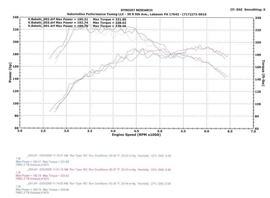 I don't want to recommend or bash this product, I am merely posting my dyno's so people thinking about buying them can make objective decisions. I, however, would interpret the data as indicating that neuspeed's pullies are worthless. Sure, 1.8T dynos aren't super consistent but a 3 hp and 4 tq loss really is hard to swallow when I should be gaining hp. Oh well, live and learn.