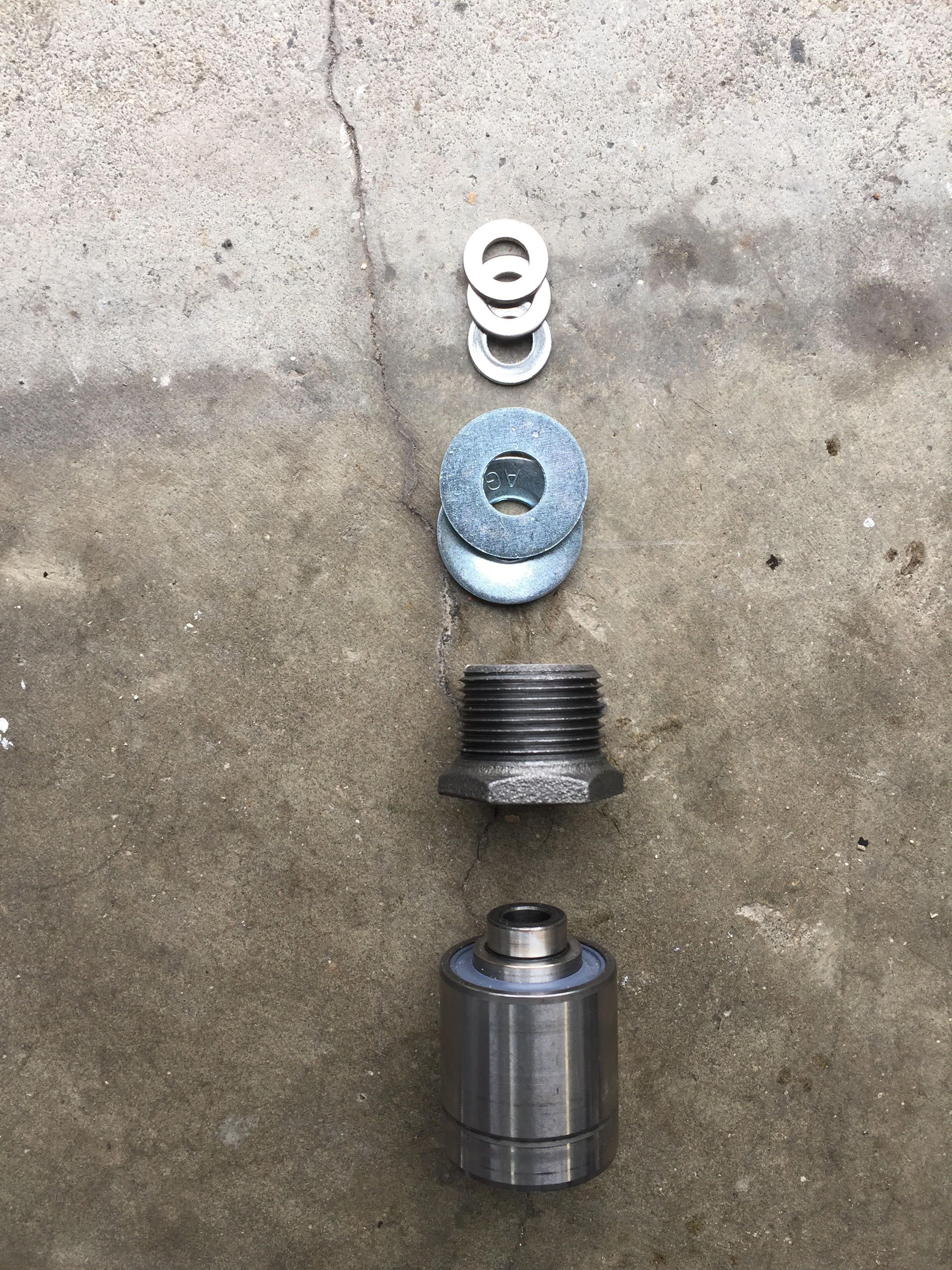 1"->3/4" Steel reducer bushing, corners filed down to the O.D. of the bearing