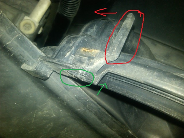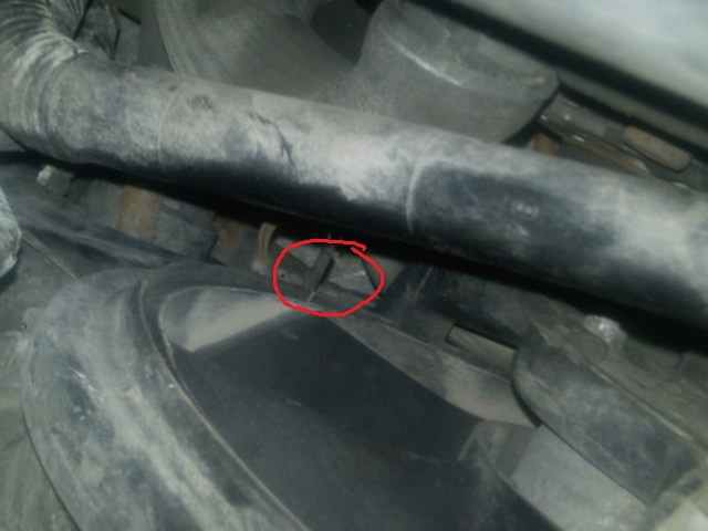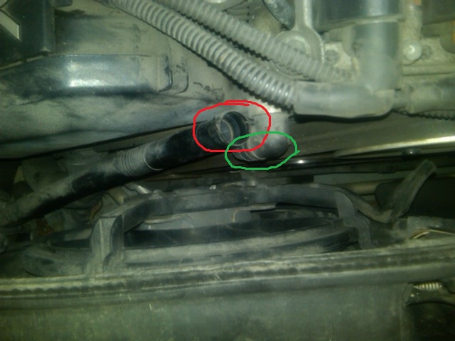 5. Now remove the hose, which i believe goes to the SAI. Wiggle the circle in red, down and away from the circle in green. Put it off to the side or use something to hold it away from where you want access.