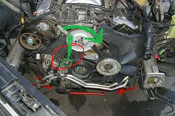 9. The red circled area is the tensioner. Place the 17mm socket wrench where circled in the green and turn as shown. This will relieve pressure permitting you to remove the serpentine belt. It is easier if you have someone holding the wrench while you remove the belt. (I didnt really took it out of the engine...I just put it aside. If you take it out, they say to mark it which direction so you can put it back to what it was)