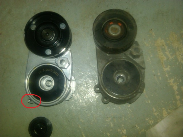 12. New and Old tensioner. On the new tensioner, there is a little pin that you have to remove (circled in red). Use a vice grip to squeeze the 2 holes together so you can push out the pin. BE CAREFUL when you remove the vice grip. When i removed mine, the tensioner snapped into place. I would have preferred that it didnt....