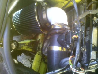 just a simple short ram vented to the outside without extending the pipe. 3" inner intel, heat shield on the side,and i was on the process of heat wrapping the exhaust manifold.
