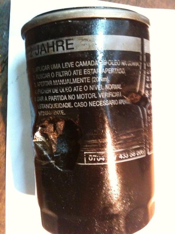 OK, now time to remove the oil filter. Simple enough, yes? Get out the metal strap wrench...hmm, not budging. Am I turning it in the right direction? Yes. Tighten it down and try again. Snap goes the wrench, and dent goes the filter. OK, I will try a big rubber strap wrench, still not a chance in hell. Out comes the Screwdriver and hammer. Bang it through both sides and try and twist her out. Feels like it is going to bend the screwdriver. Get the 18" long cold chisel, and drive it through. All my weight, and finally it slowly breaks free. So much for turn until contacting, then hand tighten. 30 minutes.