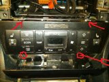 Now for the climate control (CC). I can’t remember if there are two screws holding it in at the top, but it will be obvious if they are there. The CC is clipped once at each corner. You can see the brass looking ones up top with the radio out. (See arrows on CC picture). These clips are in grooves/tracks and can move front and back in these grooves. There is a hole in the clip metal seat and if you are lucky you can grab it with a pick or small screw driver and pull it towards you (towards rear of car) enough to essentially pass the clip ridge. With these two up top sort of halfway unclipped, insert a medium sized flat screwdriver in the crack between the CC and cross member above the ash tray on each side and you should get the bottom corners to move out one at a time. (See circles and badly drawn screwdriver on CC picture). Then you’ve got it out.