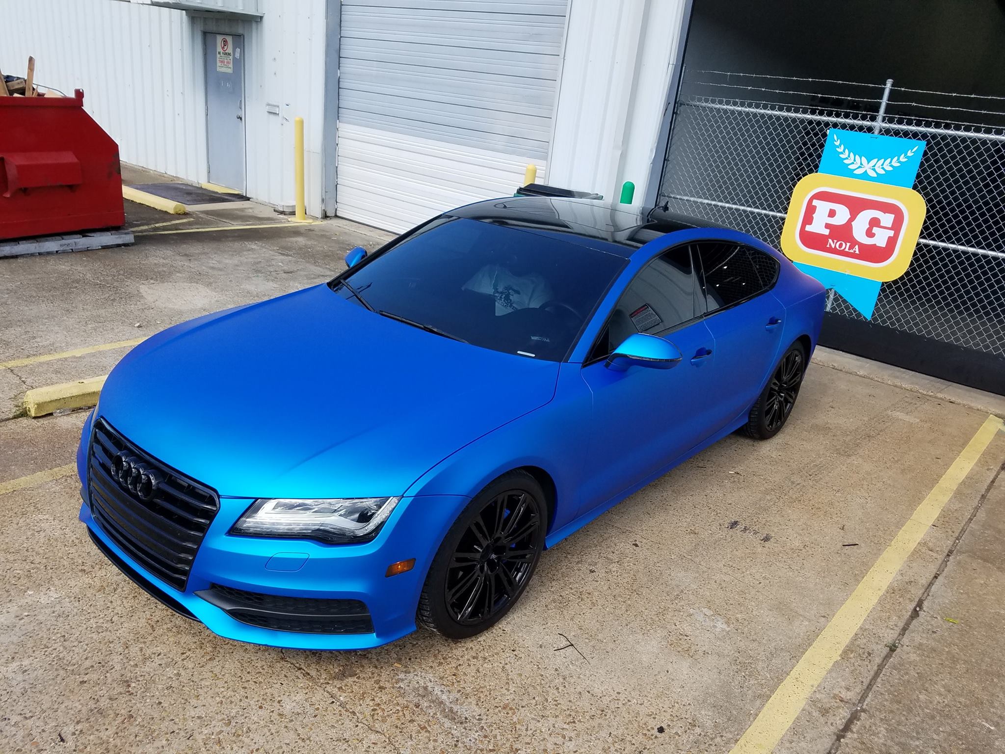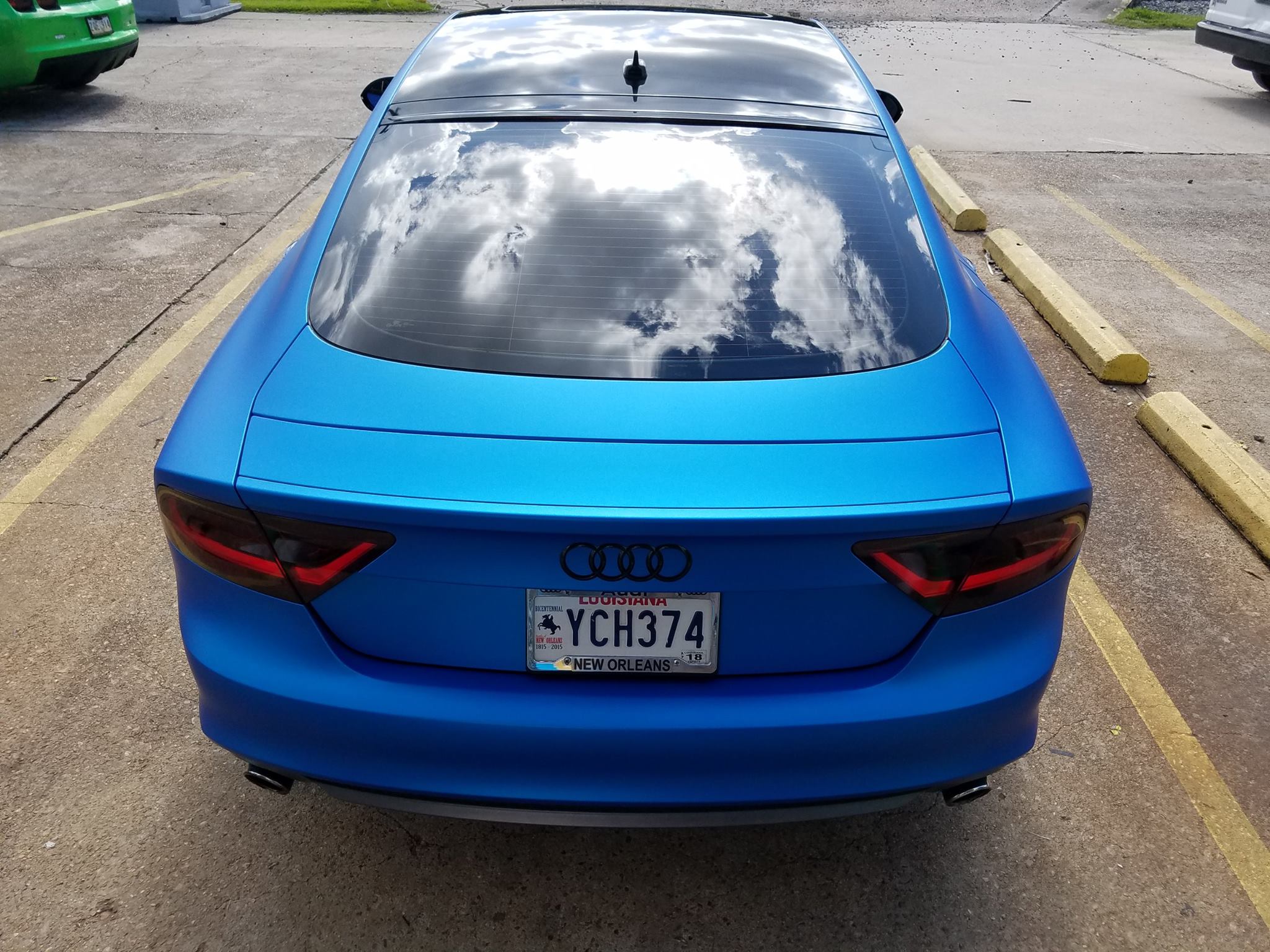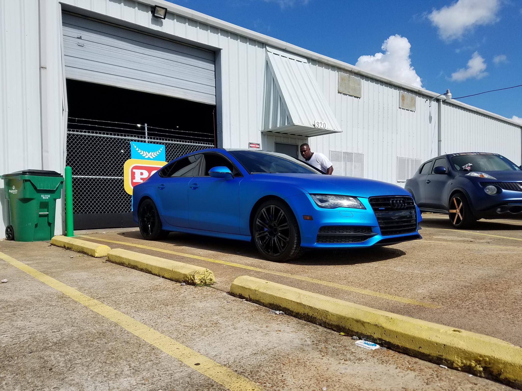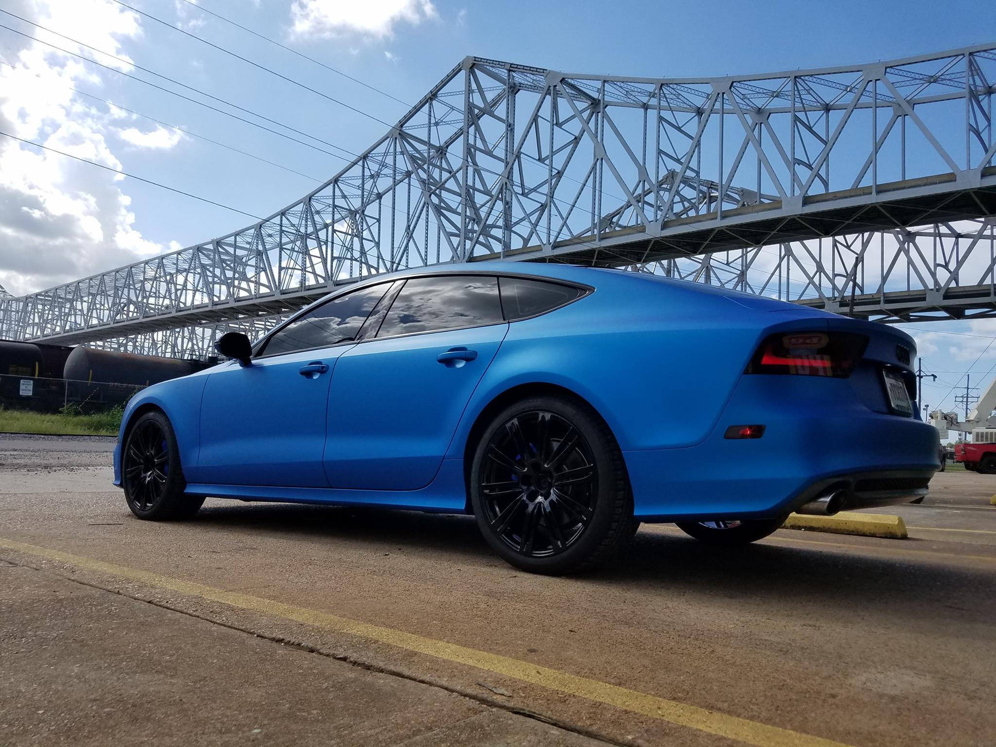 Long time VW enthusiast, first Audi. I scored a 2013 A7 Prestige, so far we love the car. It's black on black, but the exterior is wrapped in Arlon Graphics Matte Blue Aluminum w/ Gloss Black chrome delete front to back, smoked taillights & markers, Gloss Black powder coated wheels.