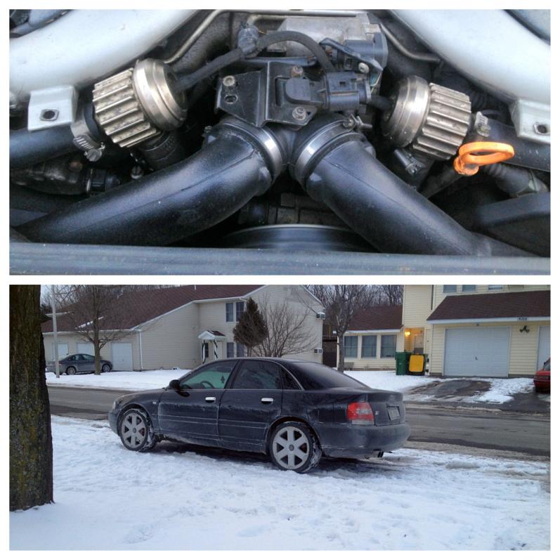 Hey guys! Just picked up my 2000 S4 last night! I've been driving my 2001 A4 1.8T for the last 2 years and I've upgraded. So I'm making my presence known here as I've been chillin in the A4 forums for a while. Anyway, my S4 has a GIAC-X tune(93oct), Vibrant cat-back exhaust, AWE DTS and from what I can tell, only by looking, Stratmosphere DV's. my boost gauge shows boost spiking at 18-19 and settles about 16-17. So it gets up and goes pretty well. Here's some pics. I'm not trying to get too crazy as it will be my DD but anyone have any advice on things I should do from here. I'm thinking I may just drop it on some coil overs and Plasti Dip the rims and chrome pieces. As far as performance, maybe some Hi-flo cats?